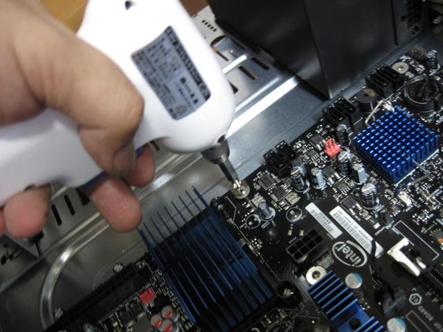 たぶんこのように使うのだろうと思われる金色のネジを付けてマザーボードを仮置きして位置関係を確認してから固定しました。