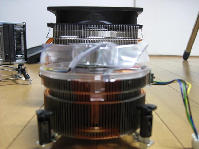 ・クーラーはマザーボードをケースに固定する前に付ける・・・これって慣れている人には爆笑ポイントなんでしょうけれど、マザーボードをケースに先に付けた方が素手でベタベタ触らないのでいいんじゃないかと思ってしまいます。結果としてケースに取り付ける前にマザーボードにクーラーを付けるべきと判断したのですけれど、そうすると重いクーラーのときにはマザーボードがしなるので何とも不安です。
