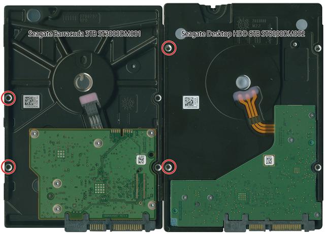 Seagate Desktop HDDのうち、プラッタ(内部の磁性体を塗布した金属ディスク>ハードディスクの語源)が6枚のHDD(8TB,6TB,5TB)は、上記のようなネジ穴レイアウトのようです。