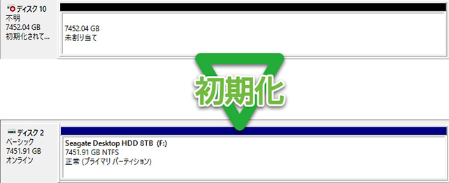 先ず、HDDをデスクトップPCのSATAポート(今回は、ASMedia ASM1061)に接続し、Windows 10のWindowsマークで右クリックして、ディスクの管理を起動して、初期化を行います。