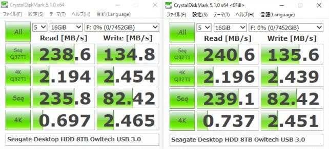 試しに、Seagate Desktop HDD(8TB)をOwltech製UASP対応USB3.0 3.5inch HDDケースに入れて、Crystal Disk Markで計測してみました。