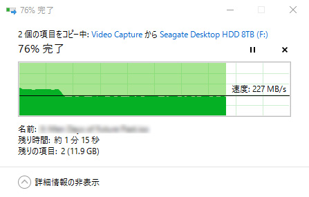 デスクトップPCに接続した4TB HDD x2(RAID-0)ドライブに保存していたHDビデオデータ50.4GBを、Seagate Desktop HDD(8TB)にコピーしてみました。