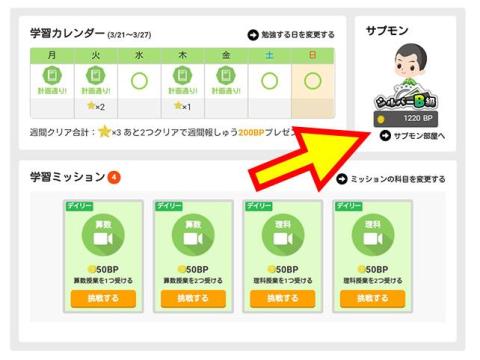 ドリルを終了させると最後に「今回ゲットしたBP:xx」と表示されますが、この”BP”が”勉強ポイント”といって、こちらのポイントがモンスター育成コンテンツの「サプモン」に使えます。