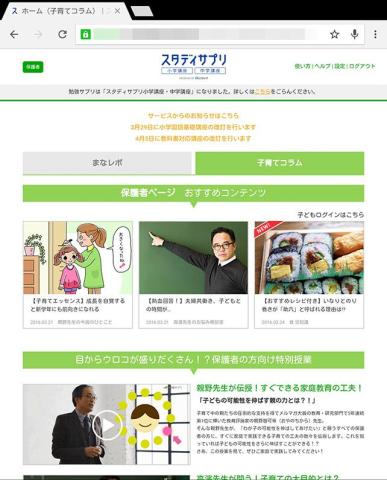 保護者用の画面では、「まなレポ」という子供の学習状況を把握する画面(授業視聴時間、ドリルの実施回数など)と「子育てコラム」という子育てに関するお悩み相談や子供の勉強意欲の伸ばし方といった様な子育てに役立つコラムや保護者向けの特別授業(動画)等を見る事が出来ます。