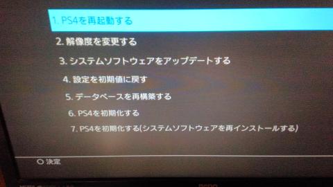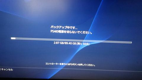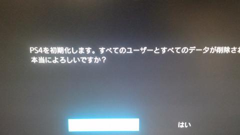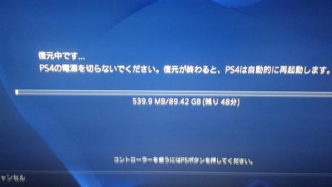 で、この確認もはいを選択するとインストールが始まります。1分ちょっとで終わったので撮影に手間取ったせいでとれませんでした。インストールが終わると再起動してPS4の競ってアップが始まります