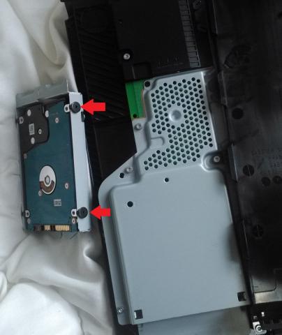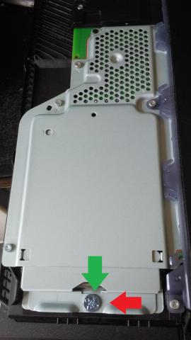 外装を外した箇所にある、赤矢印の先のネジを外して、緑矢印側に引っ張るとHDDがとれます