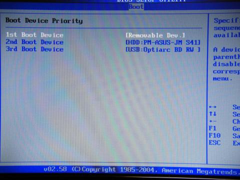 その後、BDドライブとXPのことをネットで調べていたら、"BIOSのブート設定で、存在しないFDDドライブを1stにした場合、デバイスは認識しても挿入した光学メディアは一切認識されない"との記述を発見。