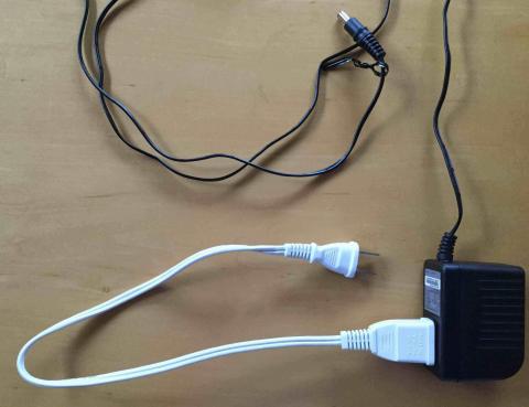 付属のACアダプターはこのての機器にありがちな隣のコンセントに干渉して塞いでしまうような向きのタイプだったので壁付けコンセントでは上下のコンセントに干渉するし、テーブルタップにはこのままでは挿せないので電源延長コードを使用しました(下の画像の白いのが延長コードです)