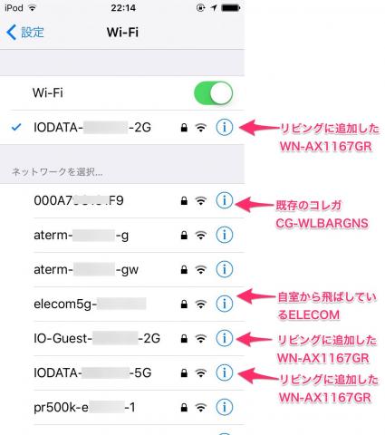 こちらへアイ・オー・データ「WN-AX1167GR」を追加しますが、家族も接続出来るように、本体にQRコードを貼り付けiPadからの接続を簡単に行えるようにしておきます。また、Mac Book ProやWin-ノートPCで接続する時に、老眼の父が暗号キーを読み取りやすいように、数字列をマジックで大きく書いて本体に貼っておきました アナログな方法ですが確実なので