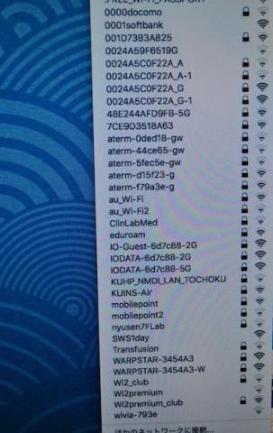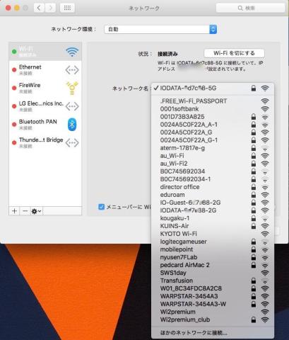 iMac右上にある通信マークからプルダウンすると表示されるアクセスポイントには、かならずWN-AX1167GRが持つ局が表示されているはずなので、そこから選択してもよいのですが、今後のためを考えて再設定しましょう。