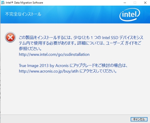 ダンロードしたzipファイルを解凍して、「idms_1044_installer.exe」を起動してインストールを始めます。すると、次のようなエラーが出てインストールすることができません。英語版のアプリケーションですが、エラーは日本語で表示されました。ただ文章が途中で切れているので、詳細は今ひとつ理解できませんが、どうやらSSDが接続されていないことが原因のようです。