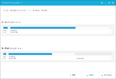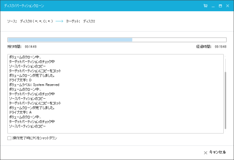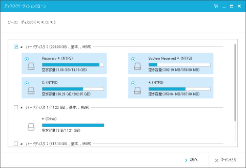 ん?ハードディスク2は容量的に今回使用するSSDですが、その他に2つのHDDが存在していることになっています。しかも、ハードディスク0は4つに分割されています。ここも、元のHDDの容量がカタログ上320GBであることを考慮し、ハードディスク0がオリジナルだと判断し、チェックを入れました。