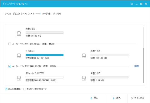 つぎは、コピー先のSSDのを選択し、とりあえずその下の「SSDに最適化」にもチェックを入れておきました。