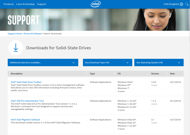 仕方がないので、とりあえずインテルのトップページから探すことにすると、SSDのページを見つけました。