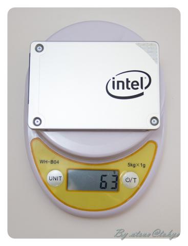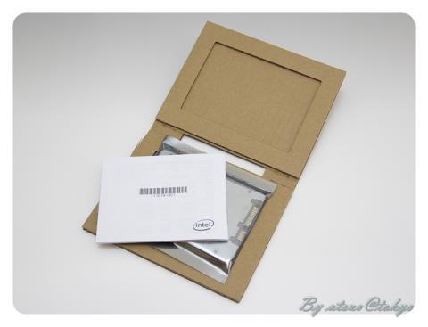 SSD 540sをこのトレーに固定する時は、「intel」のロゴが入っている面を上にし、端子がつまみのテープと反対側に位置するようにします。