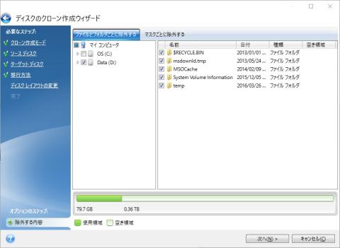 元のディスクのフォルダー内容が表示されるので、移行しないフォルダー名の前にチェックを入れます。