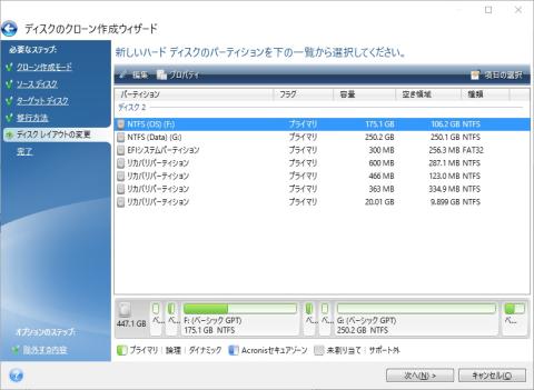 [D:]ドライブにパーティションサイズ以上のデータが入っていて一部データを残して移行したい場合は、「NTFS(Data)(G:)」の空き容量が出来るように調整して除外してください。