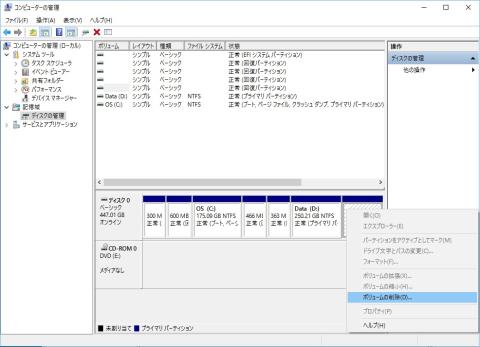 操作は「コンピューターの管理」にある「ディスク管理」から行います。