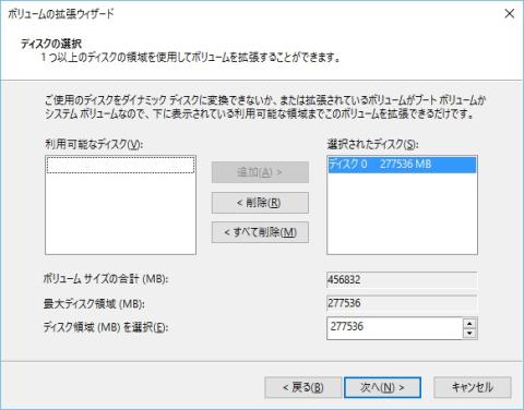 「ディスク領域(MB)を選択」の値が「最大ディスク領域」と同じ値な事を確認し、[次へ(N)]をクリックします。