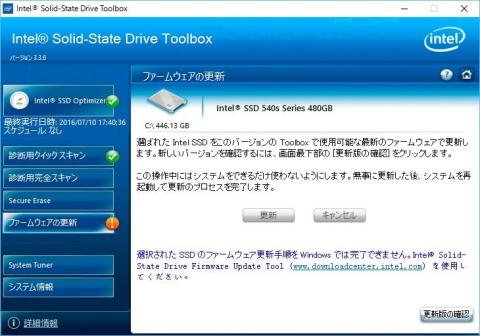 そしてファームウェアの更新が本来行えるようですが、サポート情報を読むと残念ながらインテル(R) SSD 540s シリーズはまだ対応していないようです。