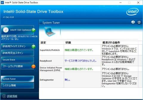 そして「System Tuner」は OSの設定を診断して、SSDのパフォーマンス等の設定を提示してくれます。
