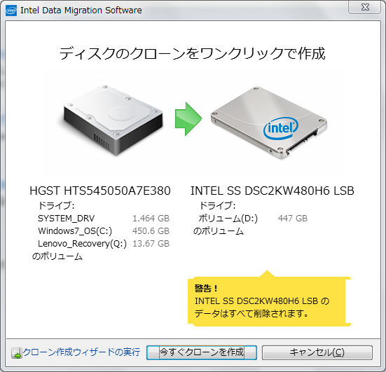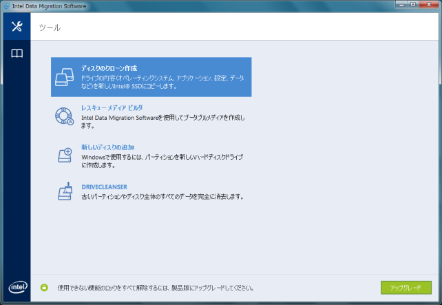 ※Intelの製品が認識できないとインストールできませんので、SSDをPCが認識している状態で行います。 - Intel Data Migration Software を起動して、[ディスクのクローン作成]をクリックします。