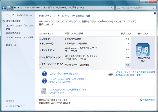 プライマリディスクの値が、HDDの 5.8 から 7.9 (Windows7の最大値)になってます。