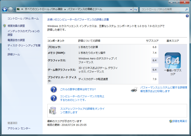 Windows エクスペリエンス インデックスの計測結果の比較です。