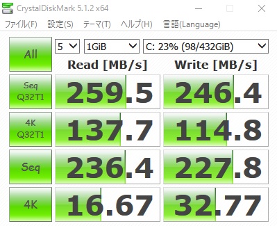 SSDの接続のためベンチマークは公証数値の約半分ですが、