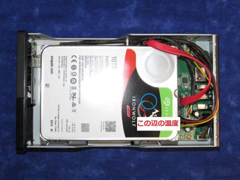動作時の温度としてCrystalDiskInfoで表示される内部温度は前出の通りですが、NAS本体でも実測してみました。