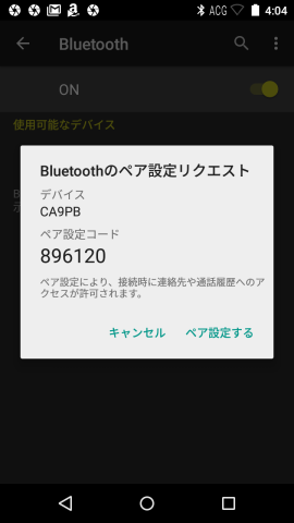 Bluetoothデバイスを検出すると、上の画像のようにデバイスが表示される。無事、CA9PB(カロッツェリアナビのマツダOEMモデル)を検出しているので、ペアリングしてみよう。