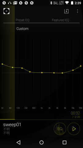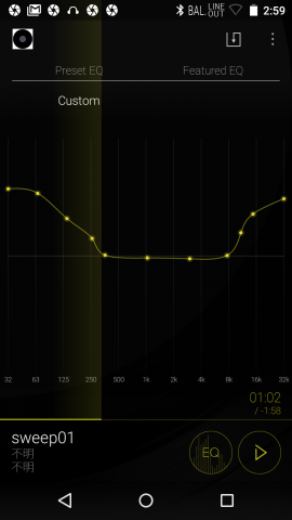 カーステレオ側では、低域と高域の増幅しか補正がないのだが、DP-X1Aを使えばノイズとかぶって聞Bluetooth経由でもきちんとイコライザは有効なので、きづらい帯域を底上げしたり、高域を少し引っ張ってメリハリを付けたりと、好みの音質に変更することが可能だ。