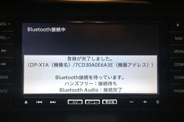 相互で接続が完了すると、カーステの画面にDP-X1Aとのペアリングが完了した旨表示された。