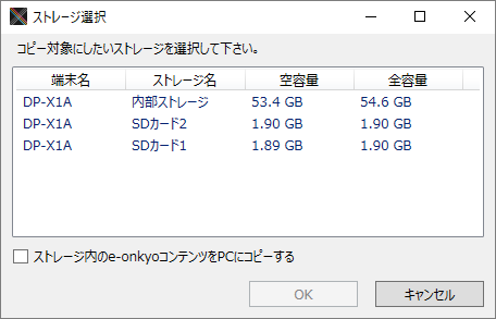 ストレージの選択が完了したら、それぞれのストレージに書かれている↓をクリックすると、そのストレージに楽曲がコピーされる。