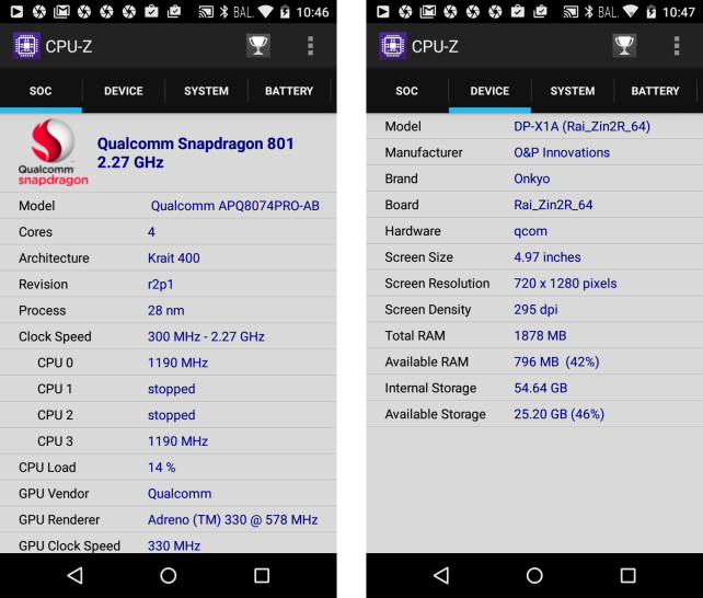 CPUはQualcommのSnapdragon801、ディスプレイ解像度は720×1280ピクセル、メモリは1878MMBとAndroid端末としては2世代くらい前のスペックとなっている。