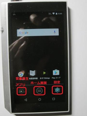 ホーム画面は非常にシンプルで,音楽再生アプリ(左下)をタップすると,ライブラリの同期が始まります.この同期も非常に時間がかかります.気長に待ちましょう! 再生アプリの隣,真ん中がandroidのアプリ画面,右側が設定画面になります.