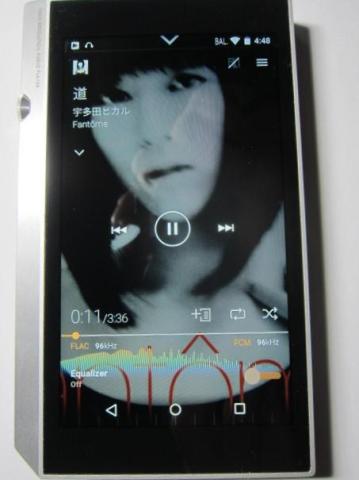再生画面は,ジャケット写真(タグ情報)をバックに,左上に再生曲名,中央下に曲戻し/再生・停止/曲送り表示,画面下にイコライザー機能兼波形表示となります.