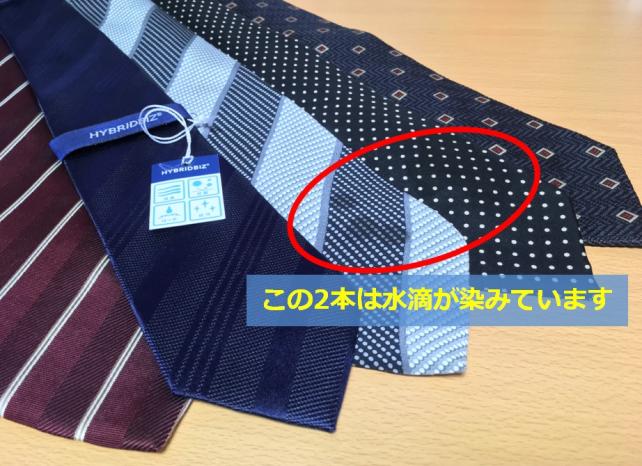 HYBRIDBIZ ネクタイは撥水・防汚がウリになっていますので、このあたりはしっかり検証したいと思います。