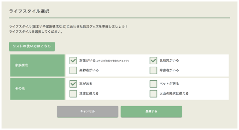 最初に家族のライフスタイルを選択すると、それに沿った用意すべき防災グッズがセレクトされる仕組み。
