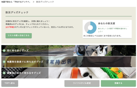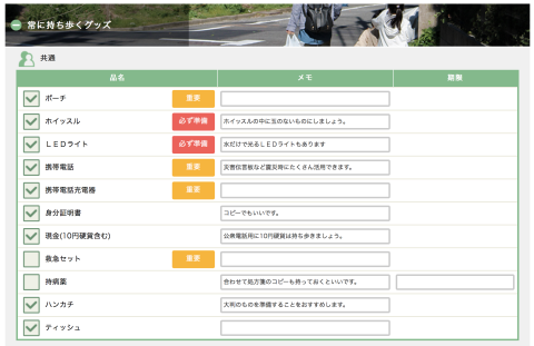 ここでは防災グッズチェックと称して、定期的に防災グッズを見直す事ができるコンテンツになっています。