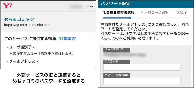 外部サービスのID連携後、外部サービスのメールアドレスがめちゃコミック(めちゃコミ)の登録IDとなり、パスワードを設定します。