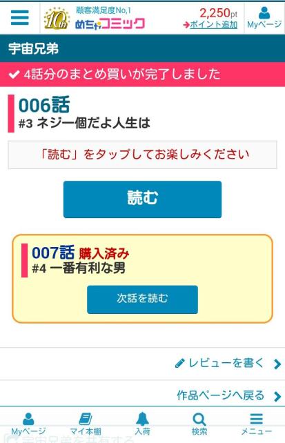 ちなみにまとめ買いは一度に10話まで可能です。購入が終わると、そのまま閲覧画面に進むことができます。