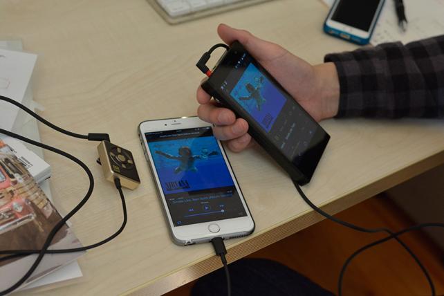 左:iPhoneでMP3を聴きながら  右:GRANBEAT DP-CMX1でハイレゾを聴きながら