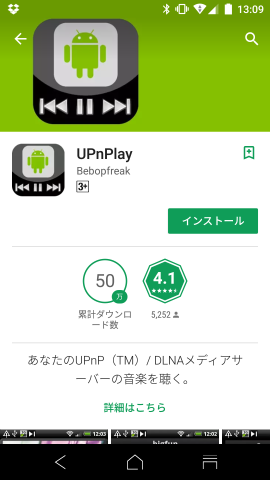 Android向けには無償のDLNAクライアントがいくつか用意されていますが、UPnPに対応したものであればVPN経由でのDLNAサーバー接続に対応できます。ここでは「UPnPlay」というアプリを使います。