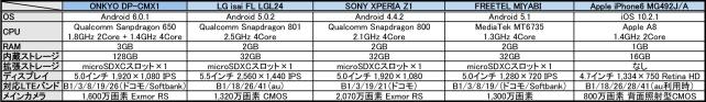 今回比較対象として利用するスマートフォンの性能を一覧にまとめてみました。