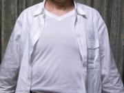 首元が目立たない様に、V首をチョイス。白の薄手のシャツなので、余り目立たない様に白を選択。