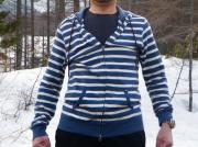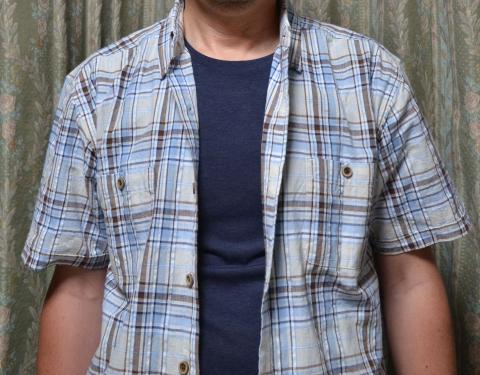 その後の、後片付け中も結構薄着で過ごしました。カジュアルなパーカーと組み合わせるとこんな感じですね。dri-comfort 半袖シャツはシンプルな単色なので、柄物やボーダーなどどんな上着でも合わせやすいですね。この写真は、ネイビーの丸首です。