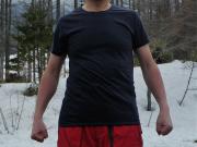 通常、スキーでは疲労軽減のために、コンプレッションタイプのアンダーを着用し、その上の汗をコントロールするためのTシャツを着ていることが多いのですが、この汗をコントロールするためのTシャツにdri-comfort 半袖シャツを使用するのも良いですね。(写真は、着替える前の写真なので、別のTシャツです。)