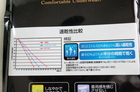 パッケージには、下の写真のように、速乾性比較があり、ポリ100%より高い速乾性、綿の倍の速乾性をうたっています。