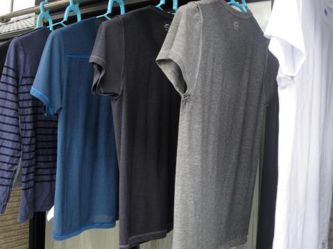dri-comfort 半袖シャツは、30分程度で脇の下などの乾き難い所を除き、目に付く所はほとんど乾き、1時間もすれば完全に乾いてしまいました。今回試した中では、No.1の速乾性でした。これは梅雨時などは非常に有難い性能ですね。(写真のグレーとその隣の濃いネイビーがdri-comfortです)
